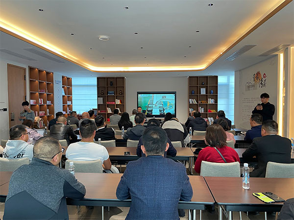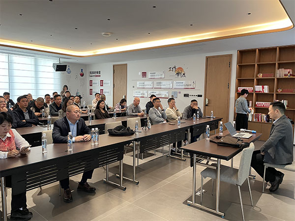 上图为:西朗门业董事长杨元嘉为苏州市九江商会的会员企业家们分享出海经验